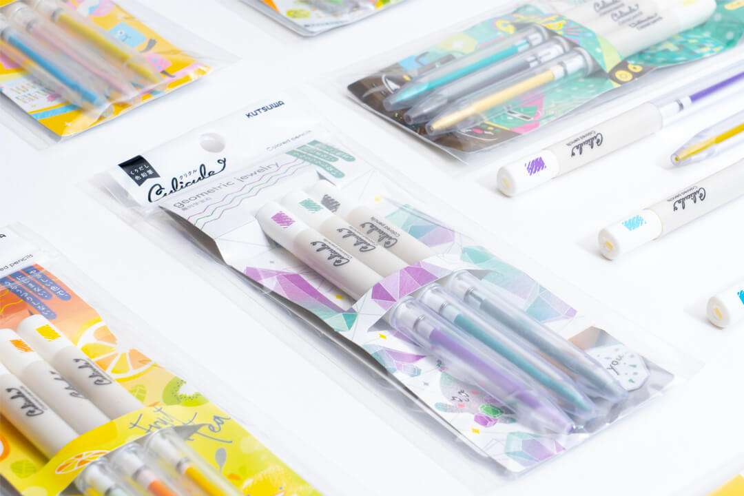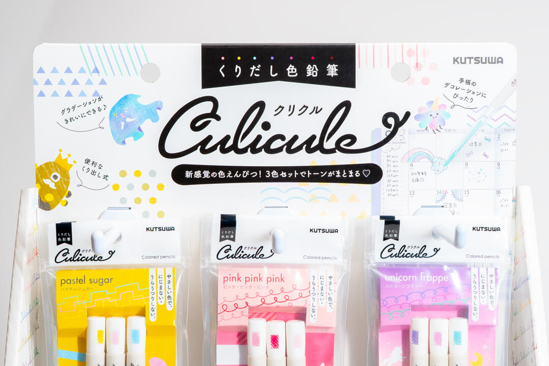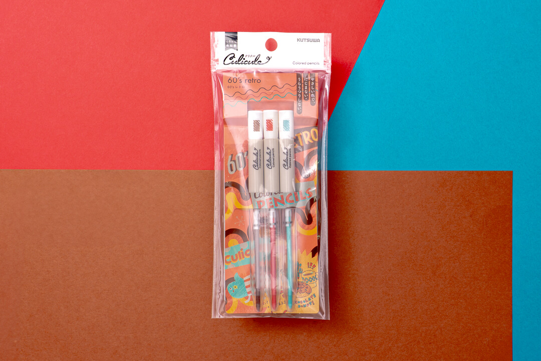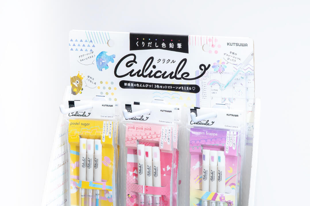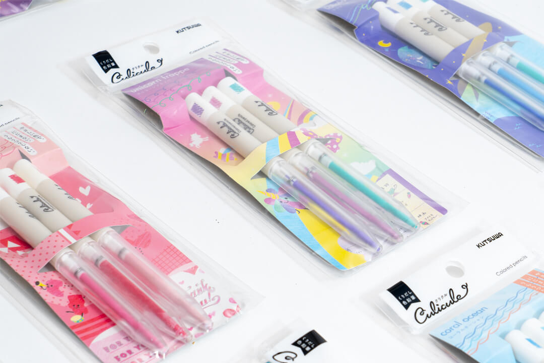 くりだし式の色鉛筆が3色でセットとなった商品「くりだし色鉛筆クリクル」のロゴと、パッケージデザインを担当しました。テーマに合わせた3色セットなので、自然とカラートーンがまとまり、手帳やノートのまとめに最適です。