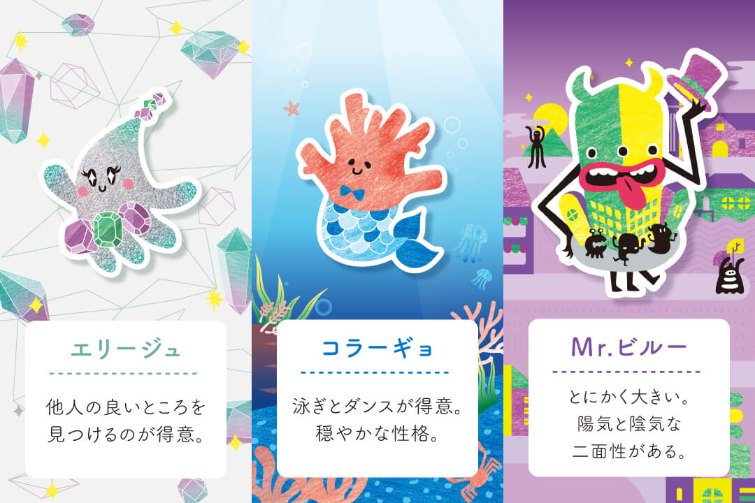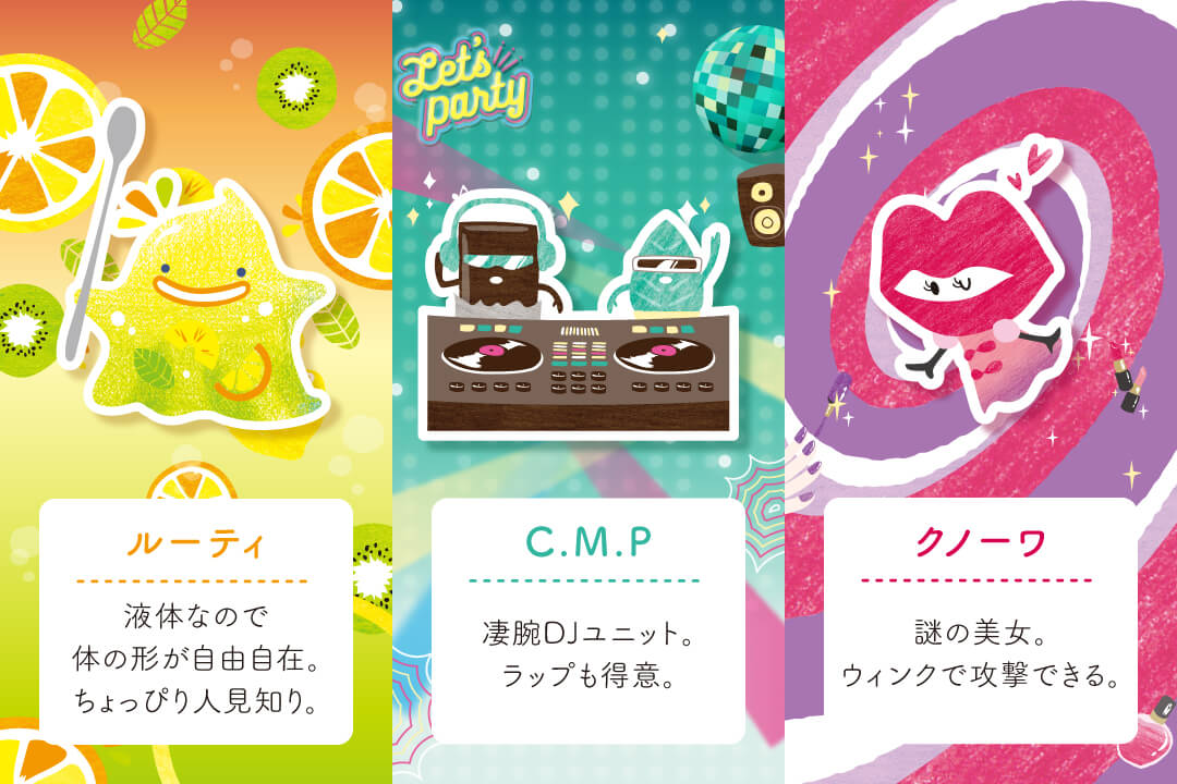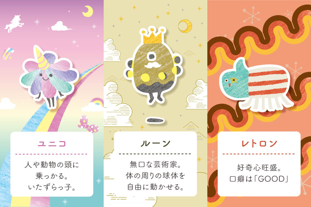 カラフルな商品の魅力を最大限に引き出し、ターゲット層に親しんでもらえるよう、商品ごとに妖精のキャラクターを開発。商品名に合わせた世界観を、パッケージで表現しています。